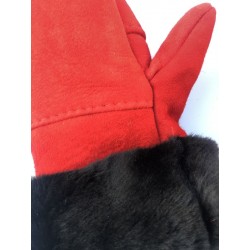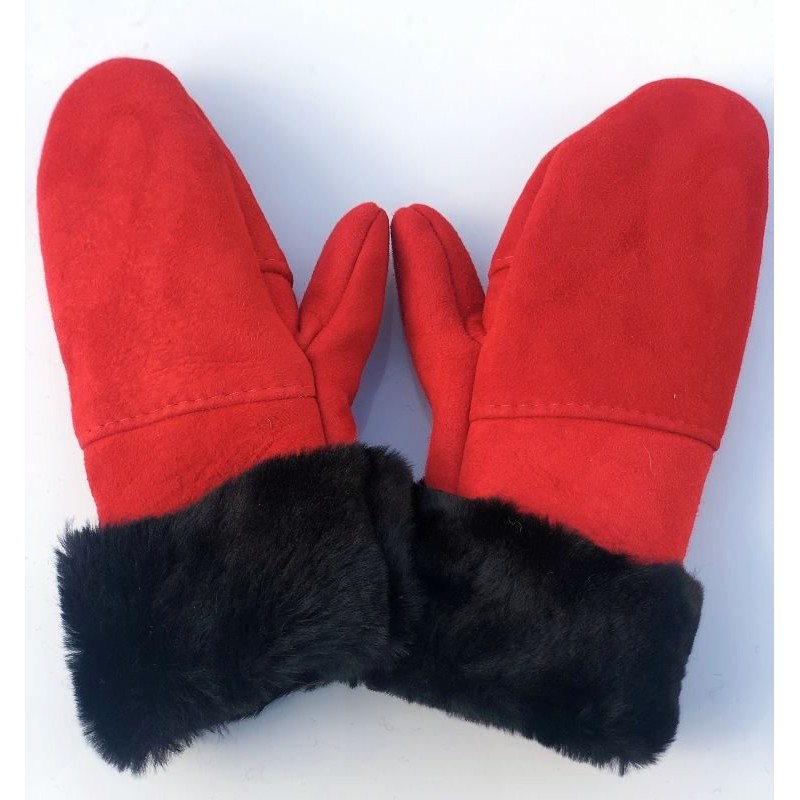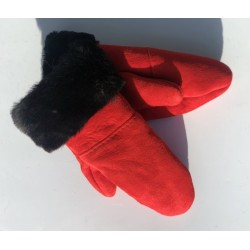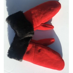 Røde votter laget av semsket skinn med sort pelsmansjett størrelse S/M.