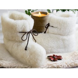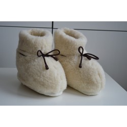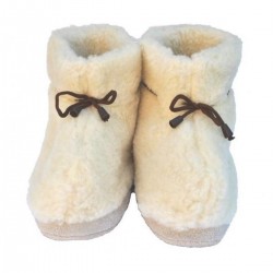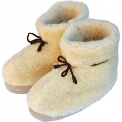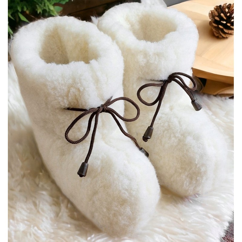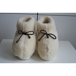 Disse off-white ulltøflene med brune snører er perfekte for å holde føttene varme og komfortable hjemme. Med en gummisåle gir de et godt grep, selv om de ikke er ment for å gå lange avstander. Nyt den myke og koselige følelsen av ull mens du slapper av!